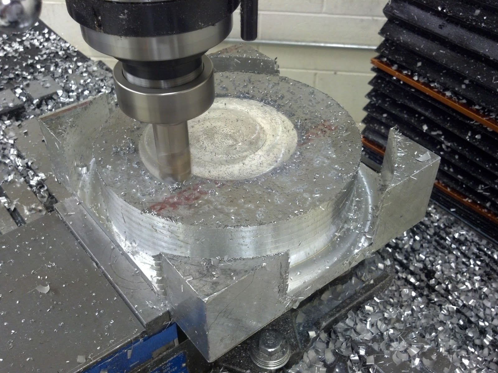 For size reference the base is 8" in diameter and the endmill is 1" in diameter. I was glad I thought ahead and assumed the endmill's edges weren't perfectly square. It left ridges as I cut deeper, so I was forced to surface the outside with a 6 flute HSS endmill. I've heard its a common problem with these types of endmills, but It's also possible it was my fault for buying the inserts from a different supplier than where I purchased the holder. I think I understand the carbide insert codes that determine their dimensions and tolerances. I may buy the more expensive aluminum specific inserts if I have another large amount of material to remove.